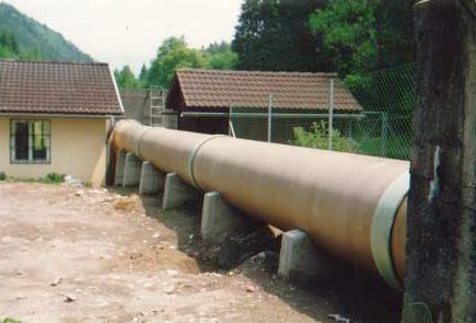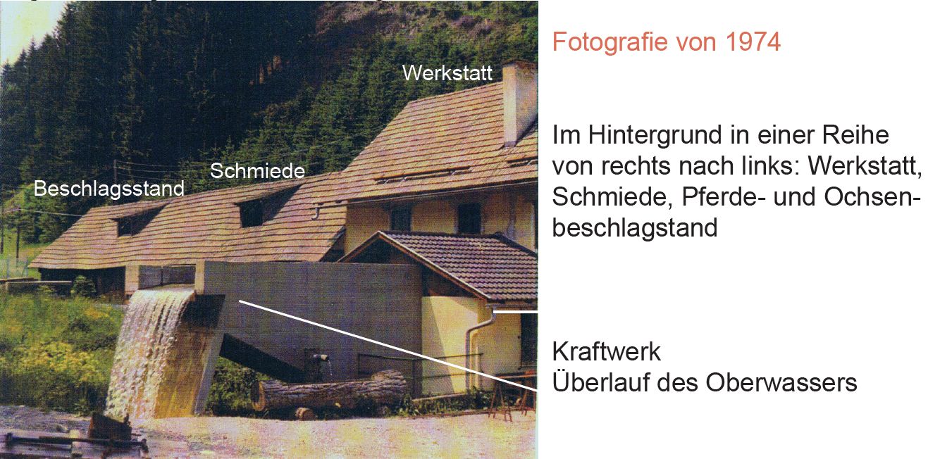 - Schmiedewerkstatt und Wohnhaus von 1933 Ganz links im Bild befindet sich das Kraftwerkhaus. Rechts daneben das große Werkstattgebäude mit dem giebelseitigen Eingang, darüber die Haus- und Berufsbezeichnung “Peter Steiner”, “Huf-Wagenschmiede” und die Hausnummer 12. Straßenseitig ist der Stiegenaufgang in das Obergeschoss noch erhalten. Gegenüber der Straße zeigt die Fotografie nach 1933 das umgebaute Wohnhaus mit dem dahinterliegenden Wirtschaftsgebäude.